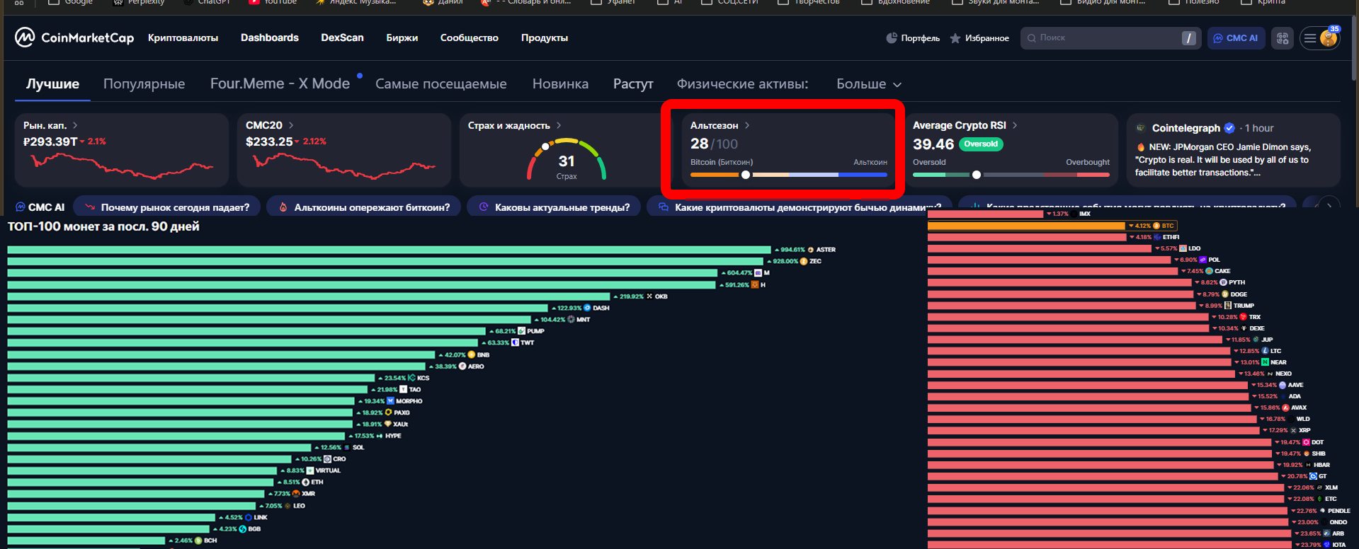 Заходишь на CoinMarketCap → ищешь таблицу "Сезон альткоинов".