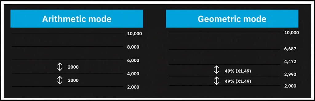 Геометрический: расстояние между уровнями пропорциональное (в процентах)