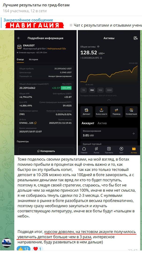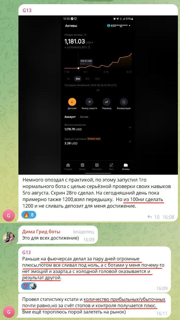 «С нуля увеличить депозит в 3+ раза — это только начало. Главное — не просто прибыль, а скорость её накопления. Если бот не делает +100% за неделю — я его не держу. Работаю чётко по своей стратегии.»