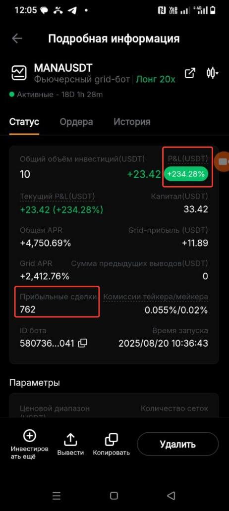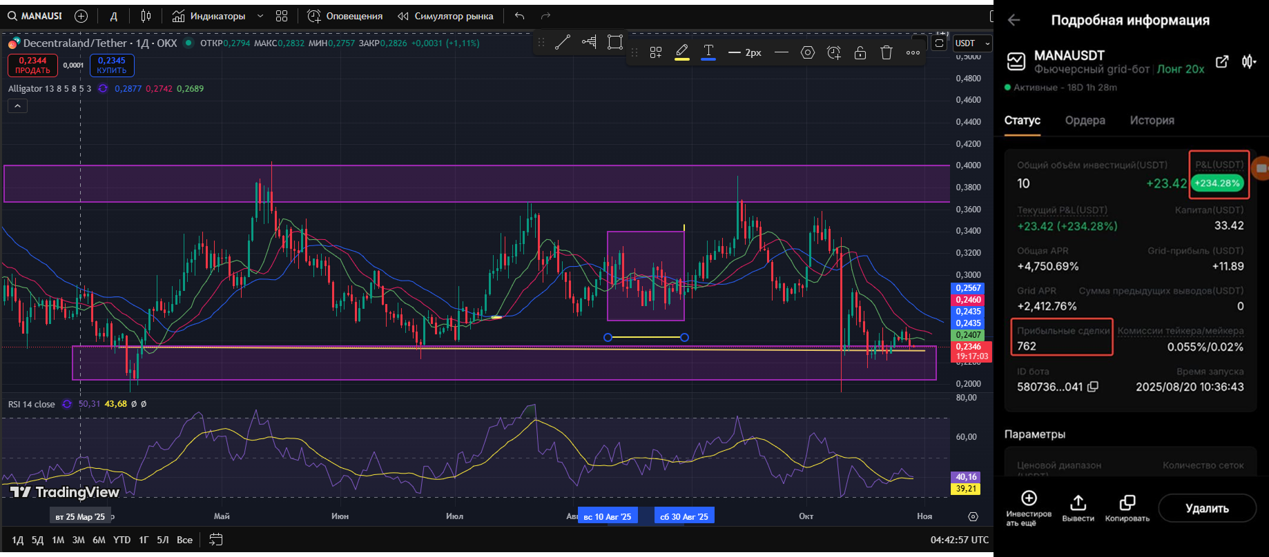 Вернёмся к пруфу с монетой MANA, который регулярно показывают ученики в канале. Бот работал на чистом флэте, когда MANA колебалась в диапазоне около 15-20%. За 18 дней grid bot совершил 762 сделки — это в среднем 42 сделки в день. Итоговая прибыль составила 234%.
