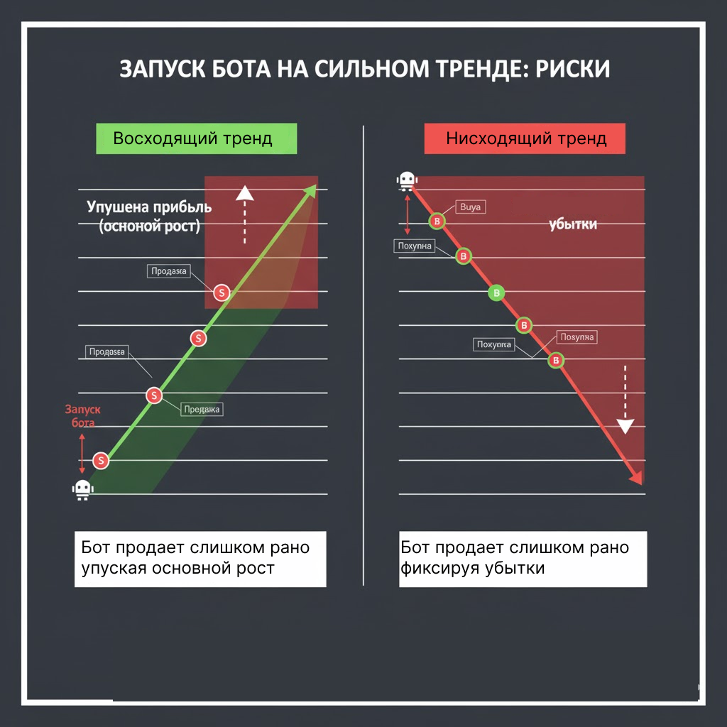 Grid bot создан для флэта, а не для трендов. Если запустите бота, когда начинается сильное восходящее или нисходящее движение, можете потерять много потенциальной прибыли или даже уйти в минус. При восходящем тренде бот будет продавать слишком рано, и вы упустите основной рост. При нисходящем тренде бот будет докупать падающий актив, увеличивая убытки.