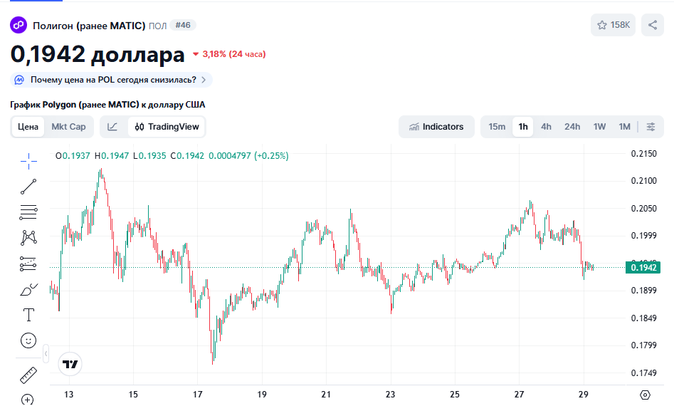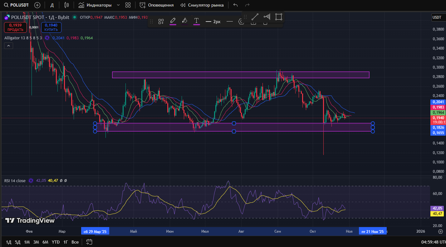 На графике четко видно, что цена POL неоднократно тестировала уровень $0.1655 (нижняя граница) и каждый раз отскакивала вверх. Это сильный уровень поддержки, который цена пробивала только один раз в октябре во время резкой коррекции.