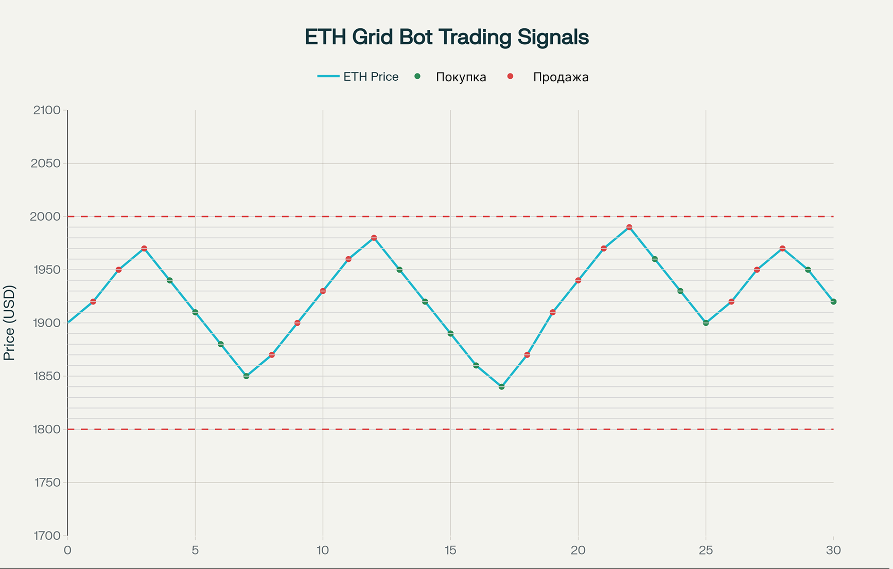 Бот автоматически разделит диапазон $200 на 20 равных частей — это будет примерно $10 на каждый уровень. Он выставит 10 ордеров на покупку ниже текущей цены и 10 ордеров на продажу выше. Когда цена упадёт до $1,900, бот купит. Когда поднимется до $1,910 — продаст с прибылью. И так по всем уровням сетки.
